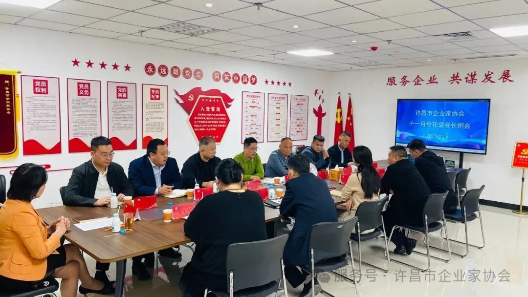 11月4日下午,許昌市企業(yè)家協(xié)會隆重舉行了十月與十一月份輪值會長工作交接儀式,并同期召開新會員入會審議會議。會議議程豐富,環(huán)節(jié)緊湊,既體現(xiàn)了協(xié)會工作的規(guī)范性與傳承性,又展現(xiàn)了協(xié)會海納百川、歡迎新生力量的開放姿態(tài)。協(xié)會十一月份輪值會長汪建成、常務(wù)副秘書長范文彥、協(xié)會部分黨員及全體輪值會長共同參與了此次會議。